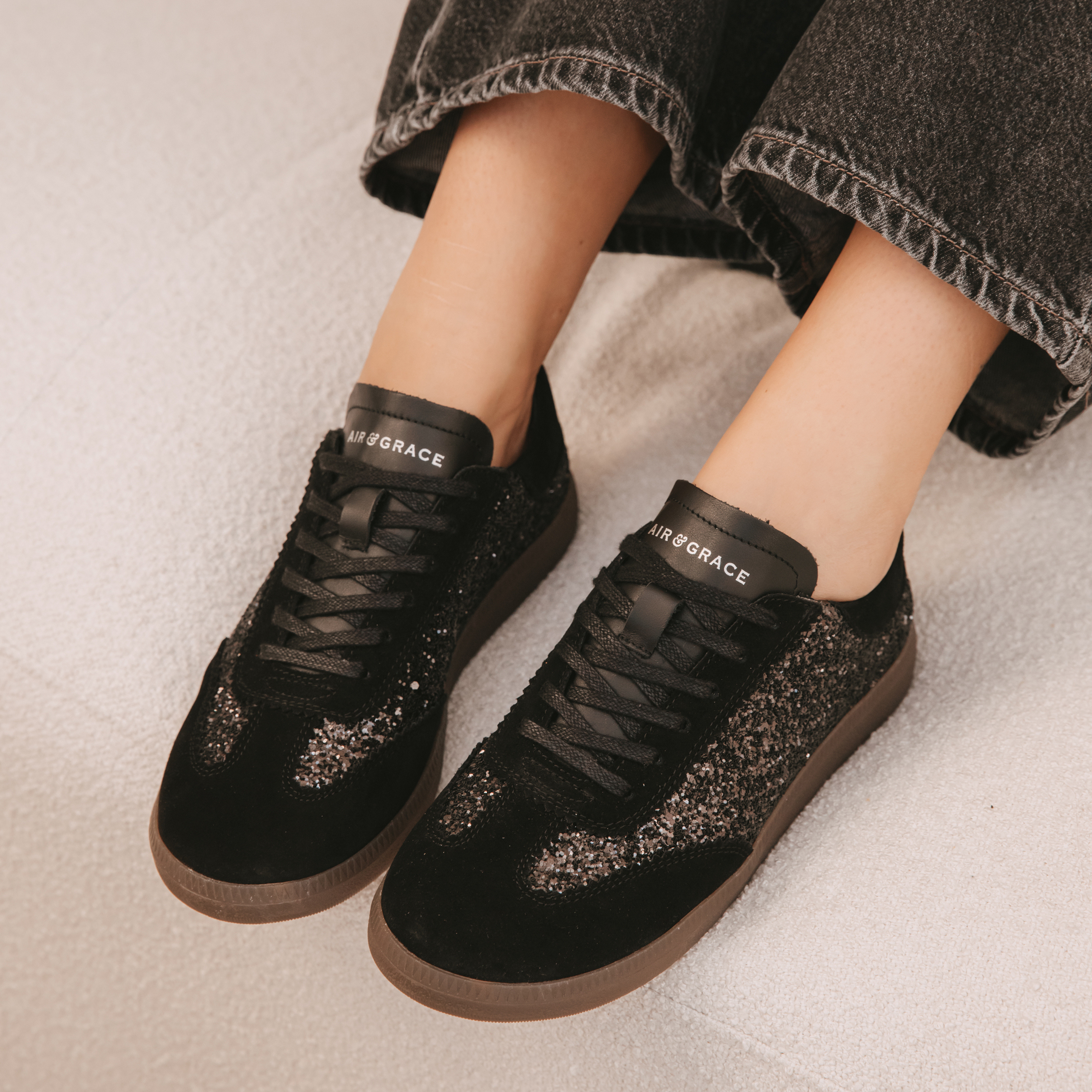 Meet the Isla trainer in new black glitter. Same cloud-like comfort, now with a subtle shimmer and suede detailing.