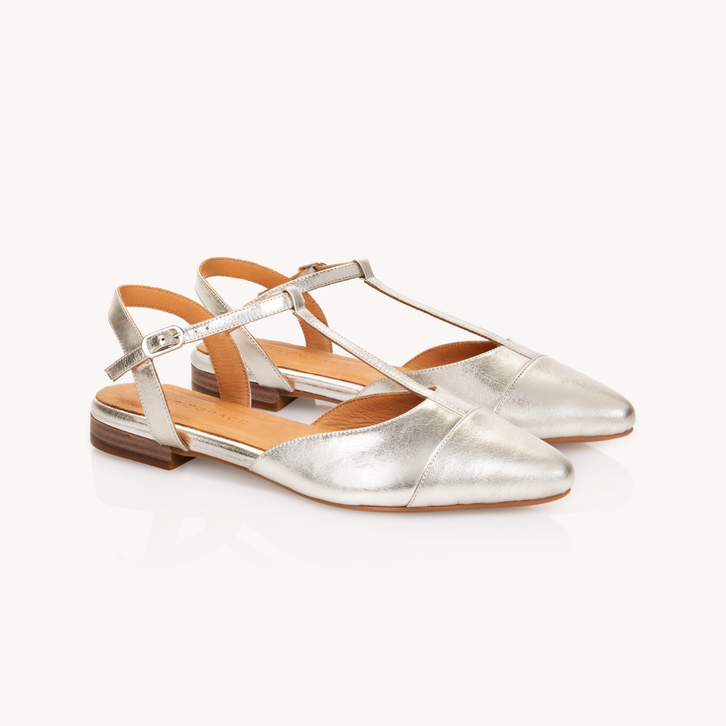 Anais Pointed T-Bar Flats: Silver Leather