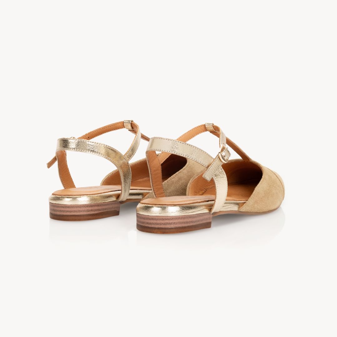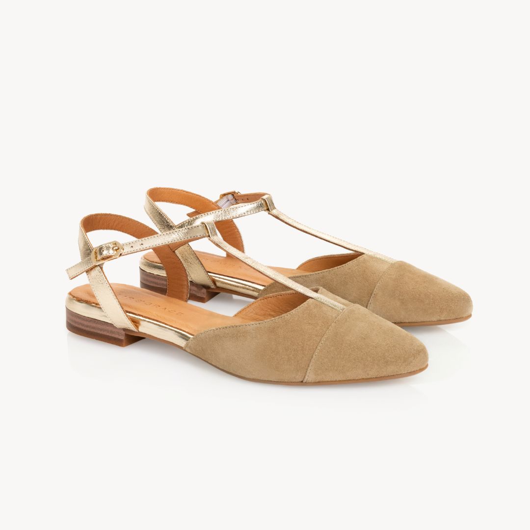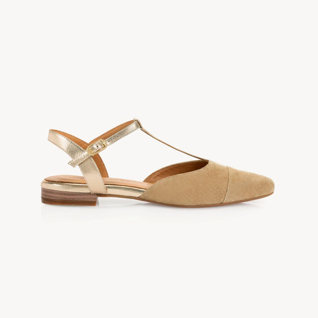 Anais Pointed T-Bar Flats: Sand Suede & Gold