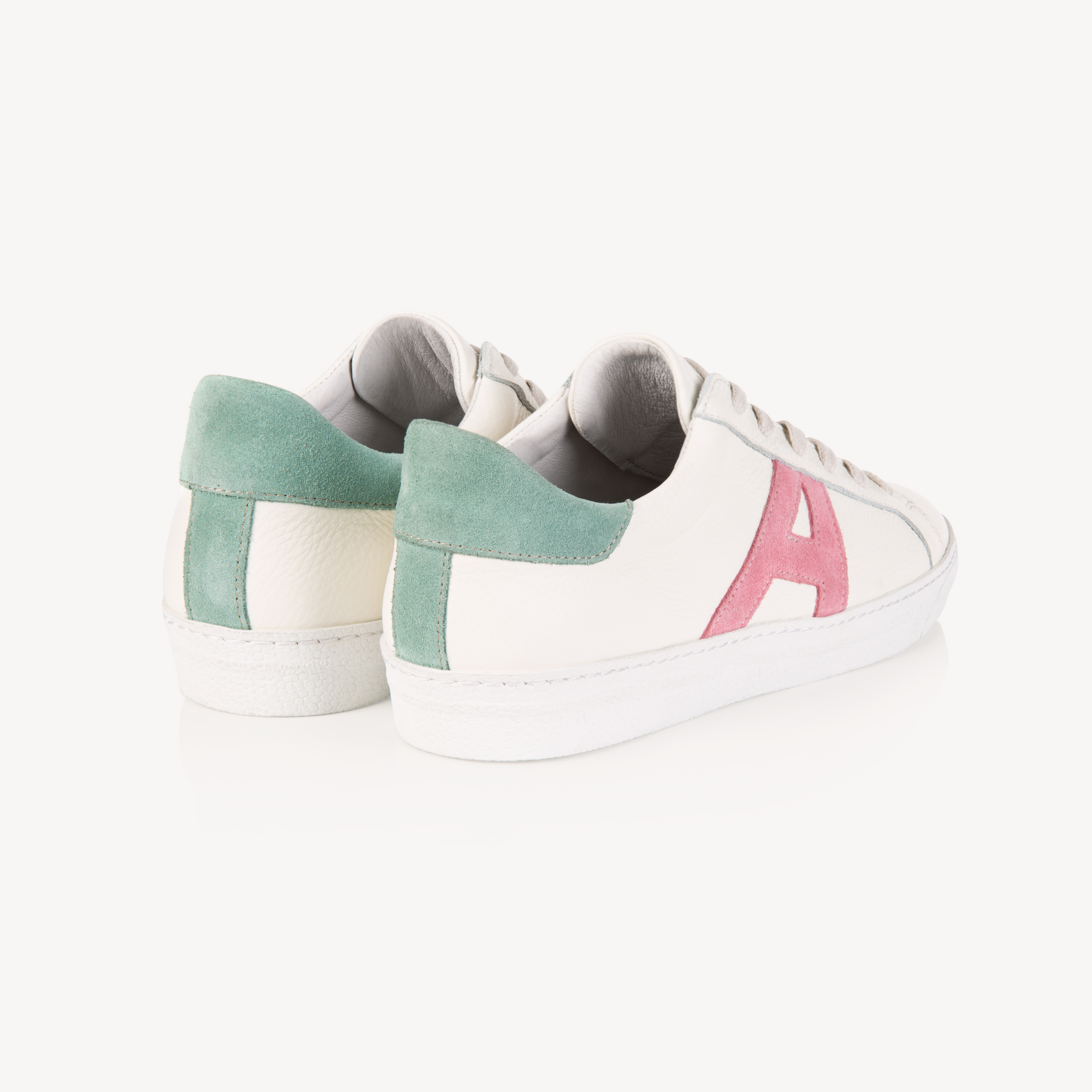 Upper: Off-white leather and pastel pink and green suedes.