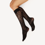 • Black lacy knee-high tight socks with a gorgeous rose design