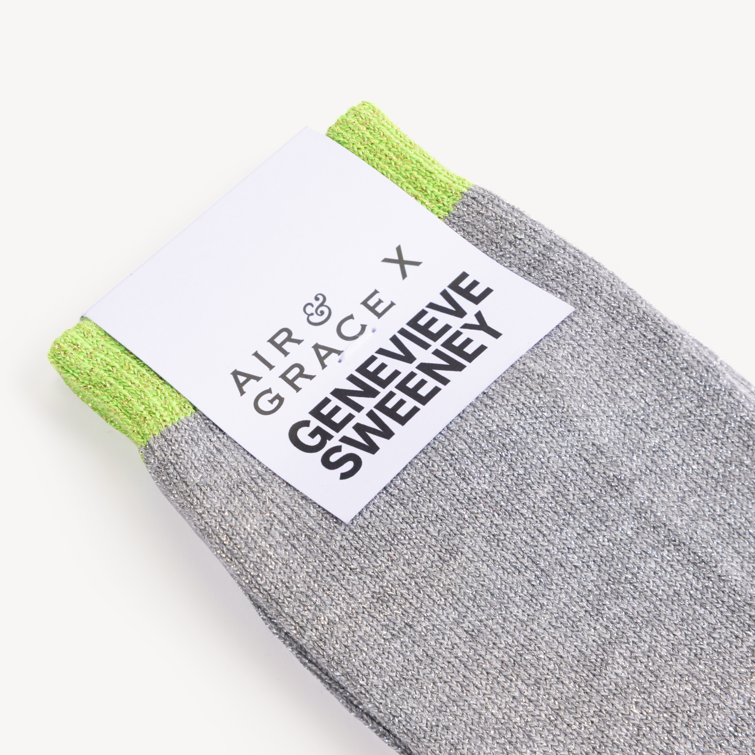Our exclusive collaboration with Genevieve Sweeney, Selina offers a touch of sparkle without compromising comfort, designed to feel incredibly soft and smooth against the skin. Sparkly silver featuring neon yellow details, a longer style that peeks out above your boots, perfect to be styled with your favourite trainers or boots. Made with care at a family-run Derbyshire-based mill in Britain.