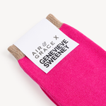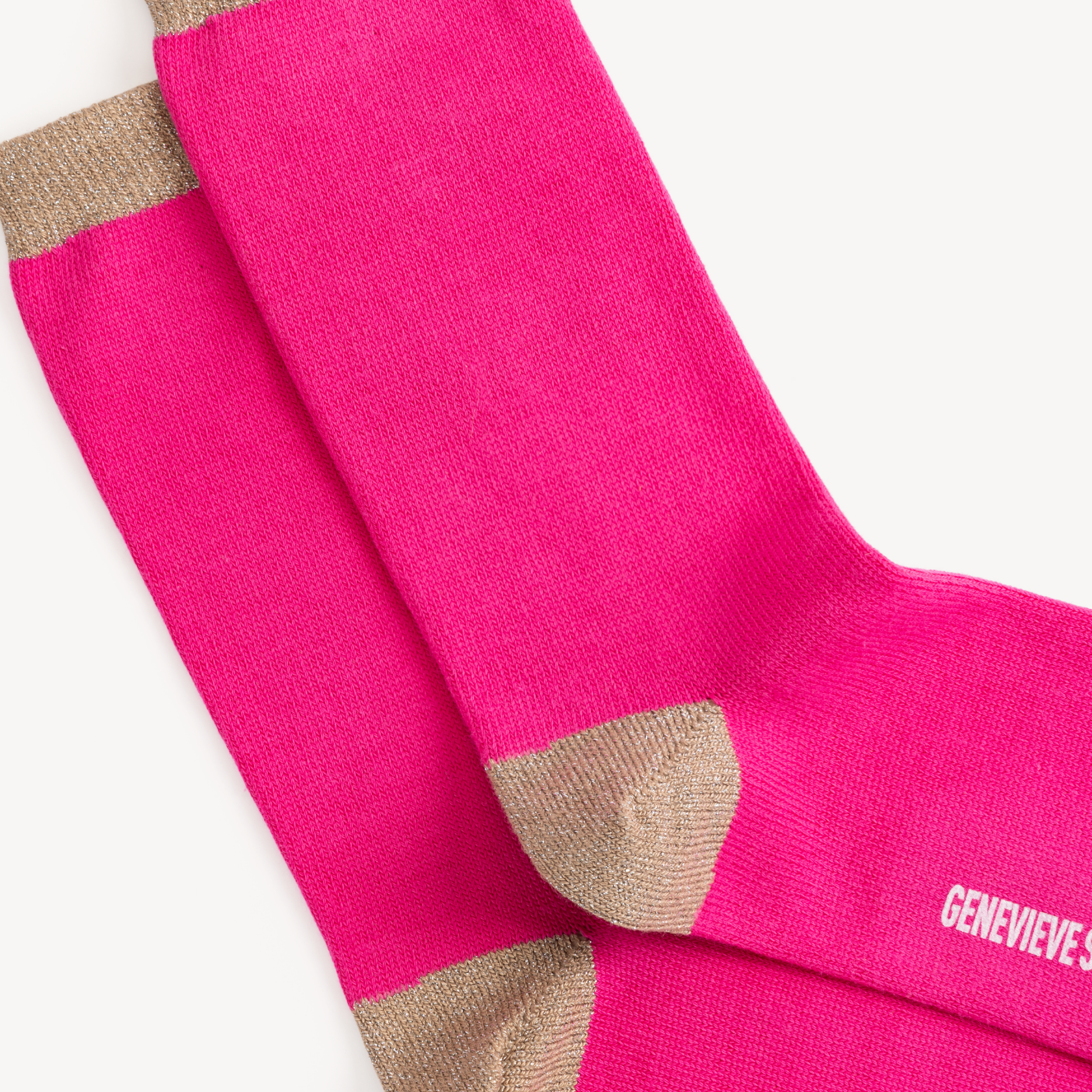 Our exclusive collaboration with Genevieve Sweeney, Selina offers a touch of sparkle without compromising comfort, designed to feel incredibly soft and smooth against the skin. Hot pink featuring sparkly camel details, a longer style that peeks out above your boots, perfect to be styled with your favourite trainers or boots. Made with care at a family-run Derbyshire-based mill in Britain.