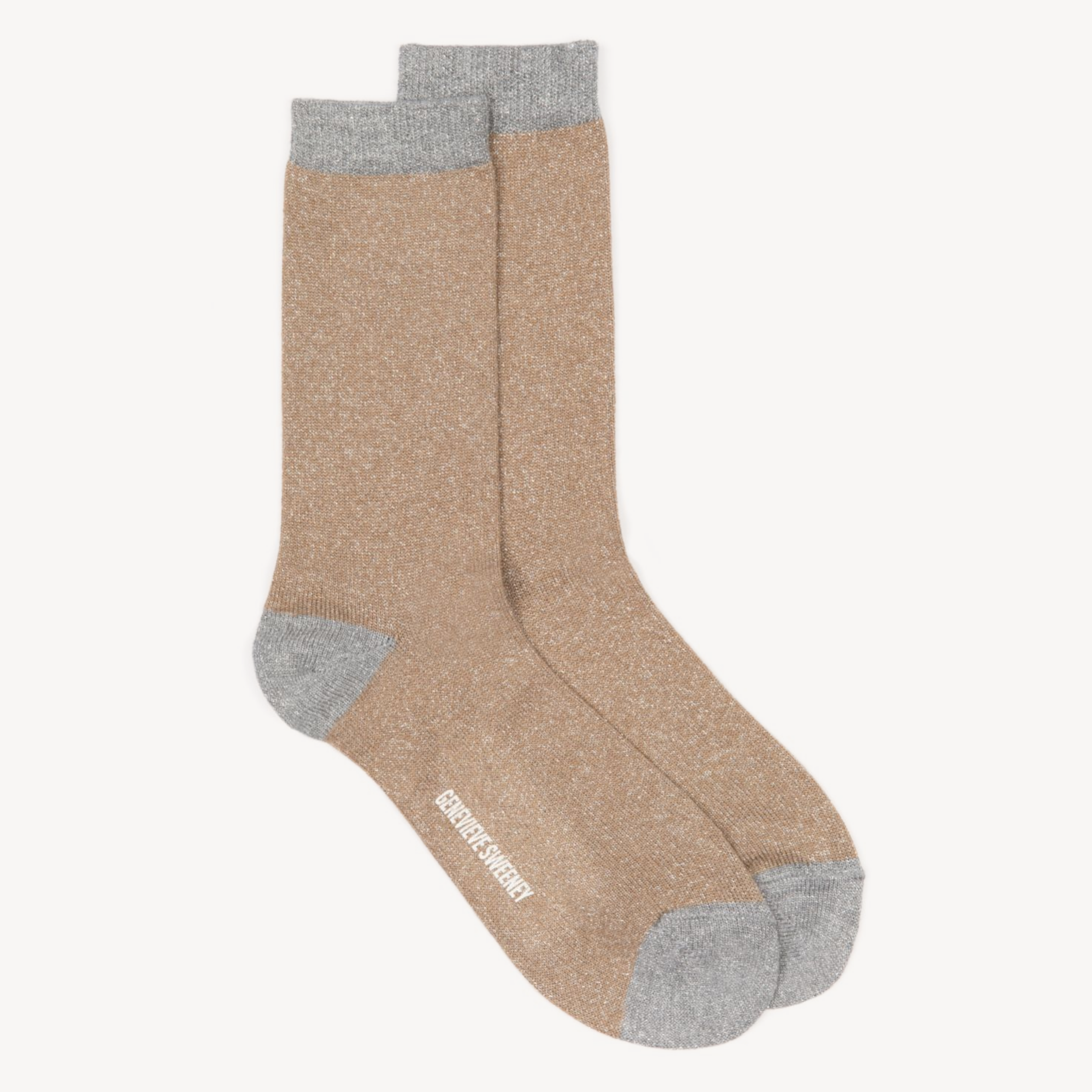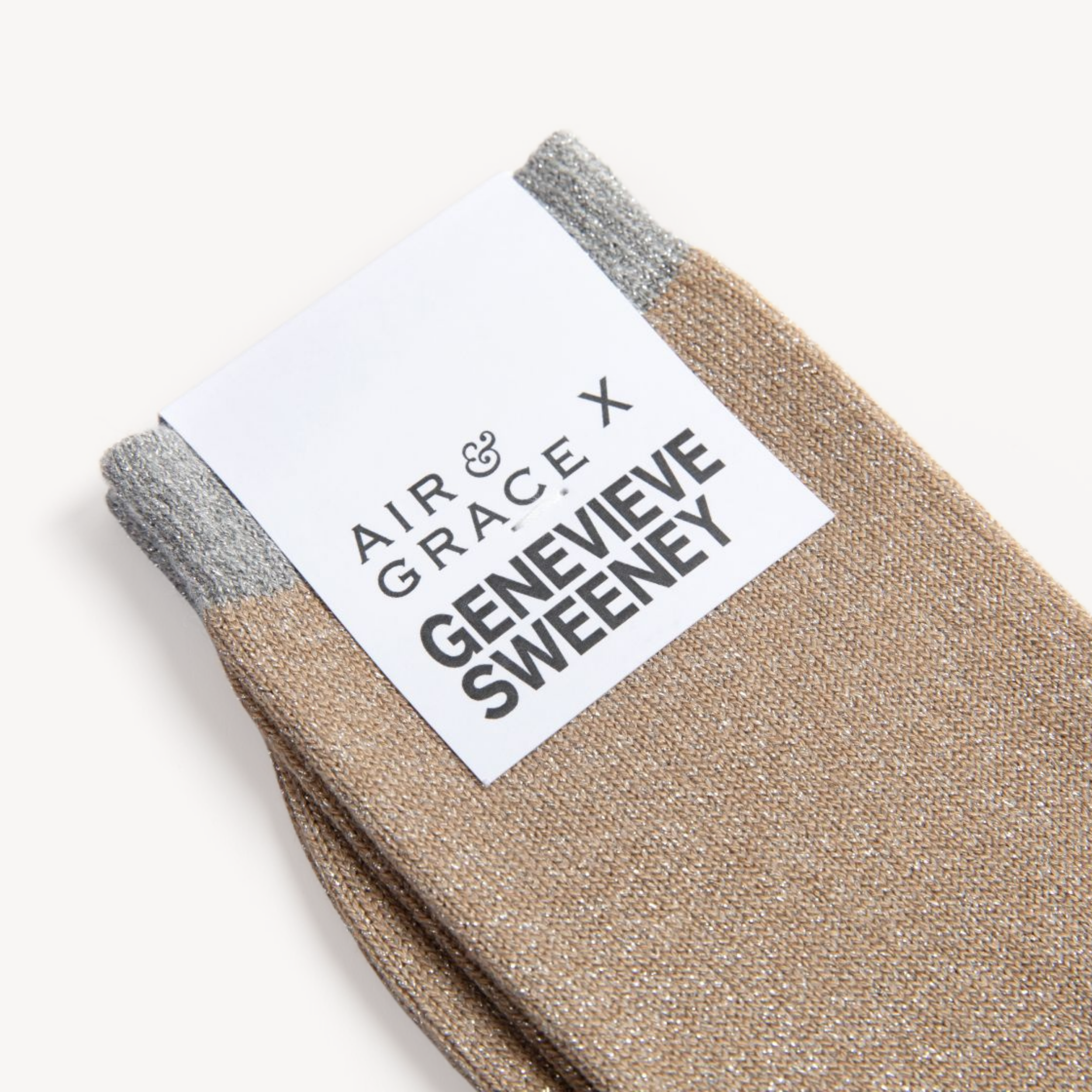 Our exclusive collaboration with Genevieve Sweeney, Selina offers a touch of sparkle without compromising comfort, designed to feel incredibly soft and smooth against the skin. Sparkly camel featuring silver details, a longer style that peeks out above your high top, perfect to be styled with your favourite trainers or boots. Made with care at a family-run Derbyshire-based mill in Britain.