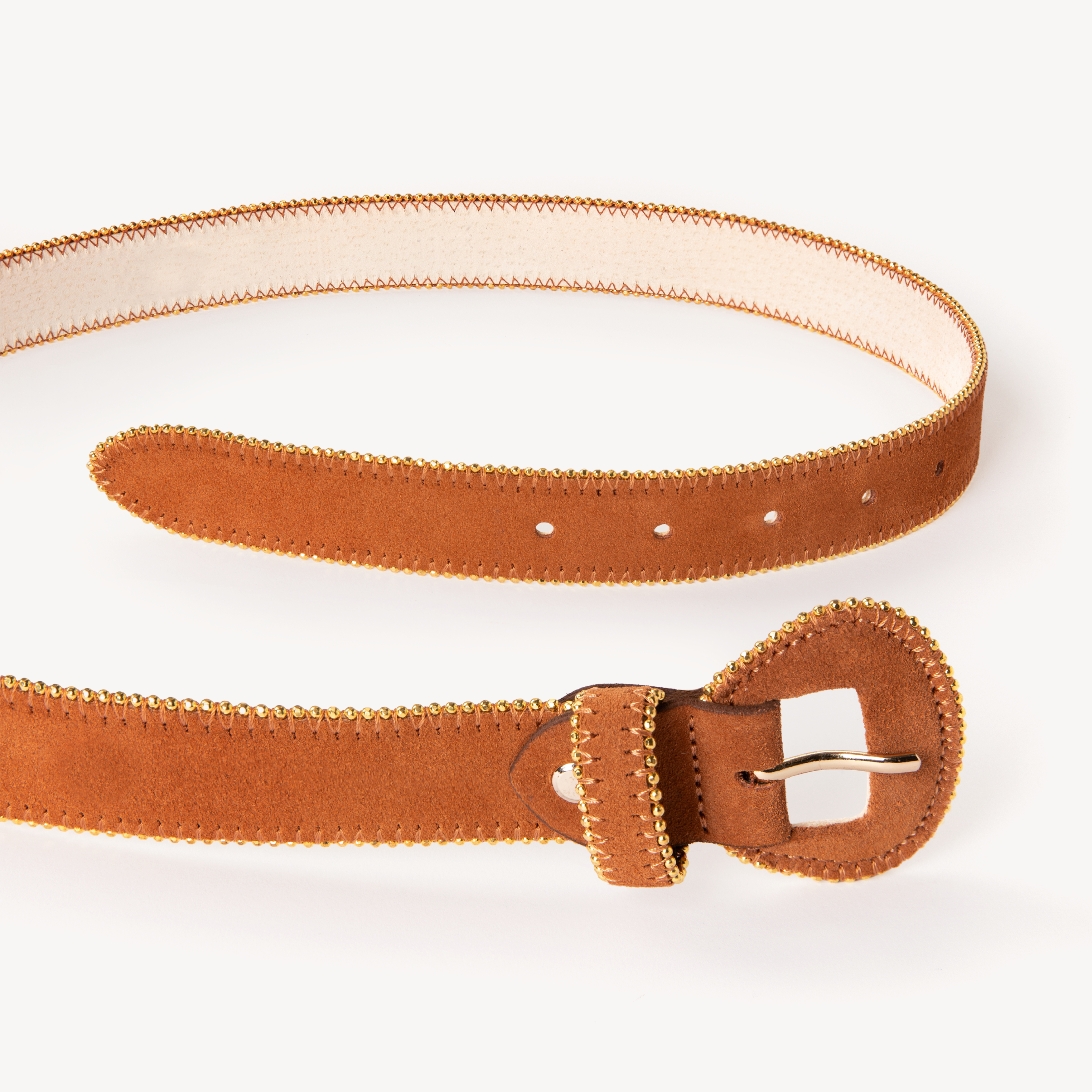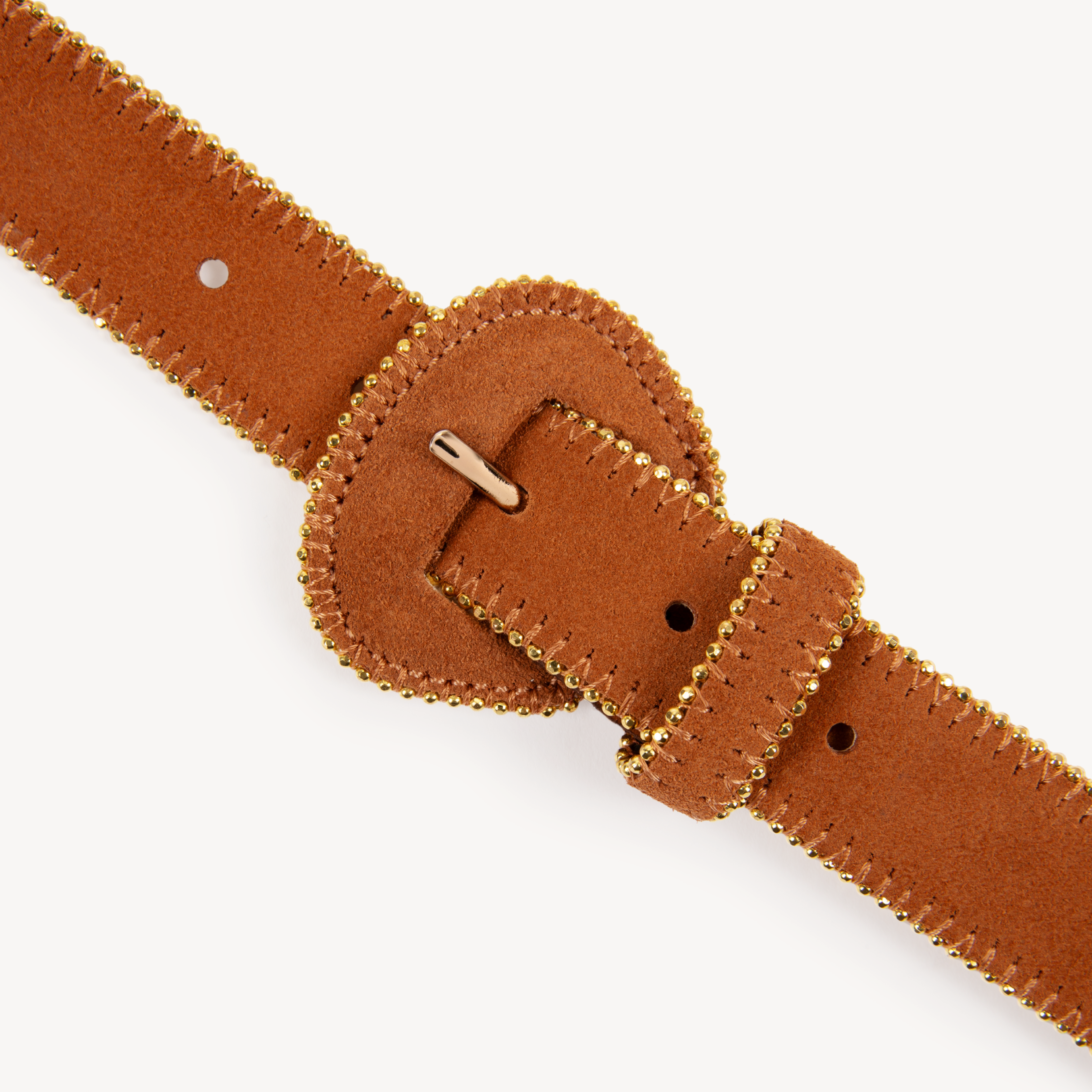 Fastening: Tan suede buckle with gold bead detailing
