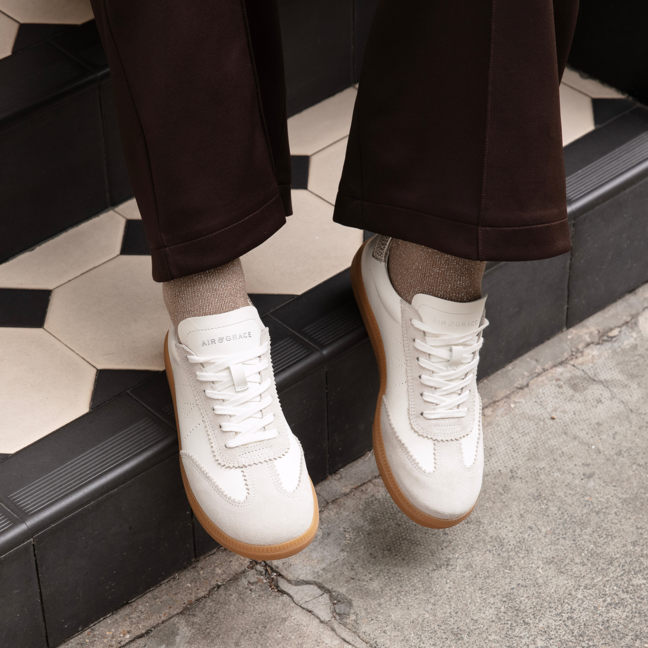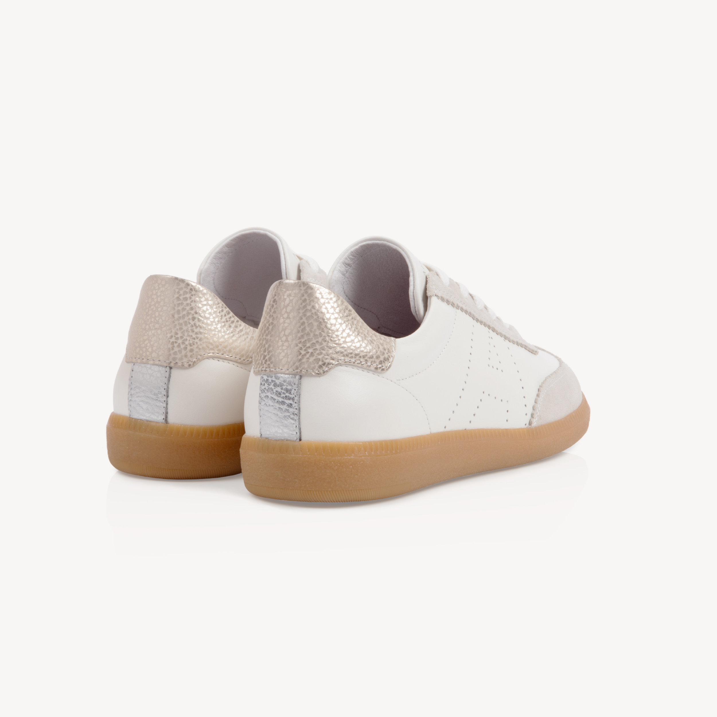 Upper: Off white, silver & gold metallic leather with perforated A and suede detailing.